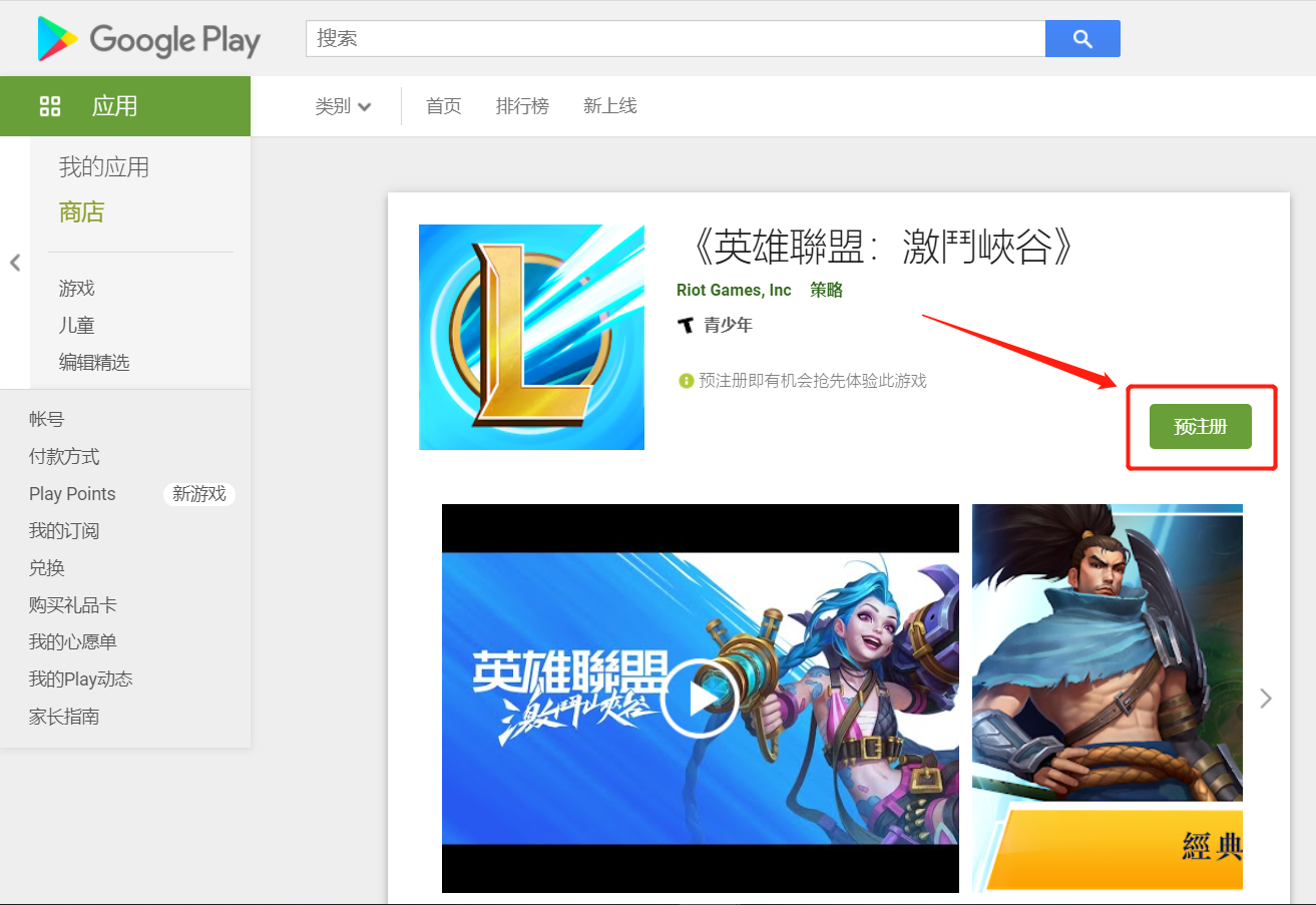 打开GooglePlay商店的方式是:通过英雄联盟手游B测官方预约地址直接进入。进入后需先登录一个非国区的谷歌账号,接着点击预约注册即可。
