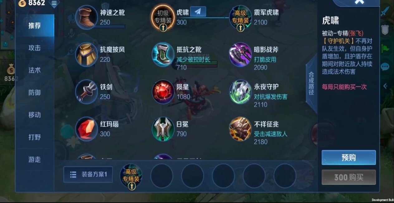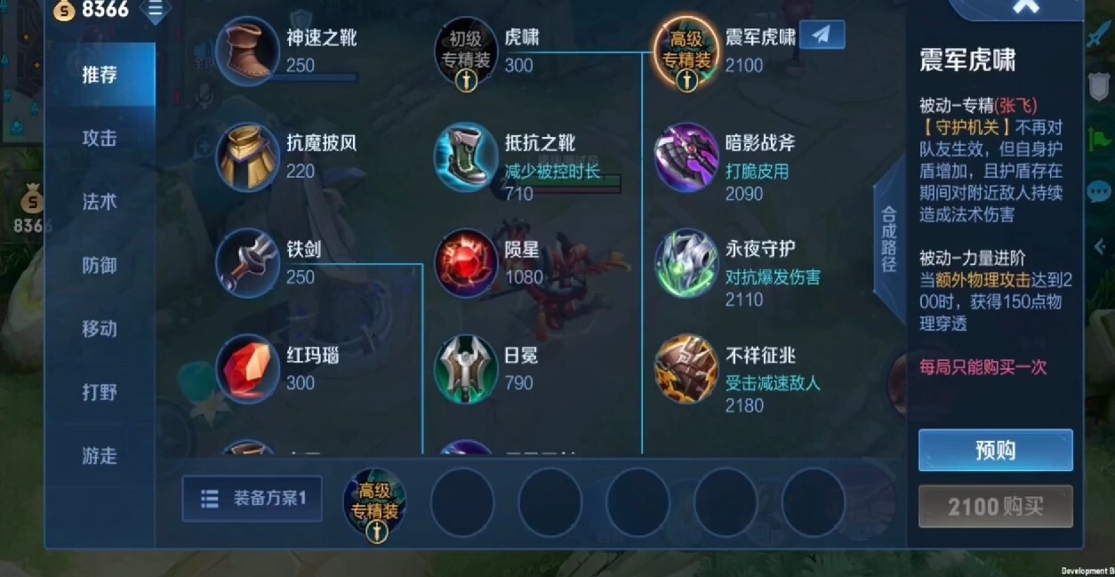 张飞的专精装包含初级与高级两个阶段,初级专精装名为“虎啸”,售价300金币,且可进一步升级为高级装备。其被动专精效果针对张飞的二技能进行调整:原本二技能为队友提供护盾的机制被移除,转而大幅提升自身护盾值,同时对周围敌人造成持续法术伤害。值得注意的是,该护盾附带的法术伤害能够与红莲斗篷、肉刀的被动法术伤害叠加生效。专精装的推出,为张飞走边路的玩法提供了新的可行性思路。