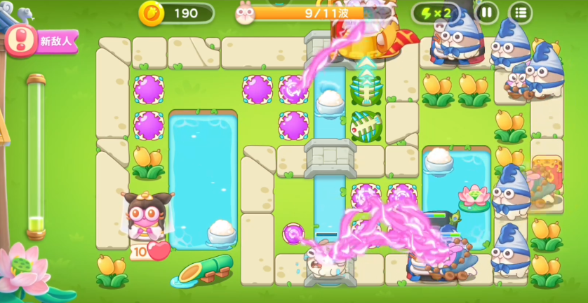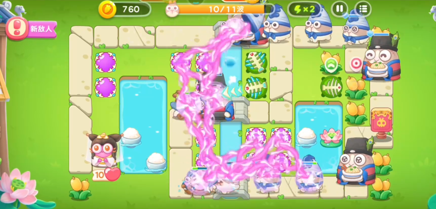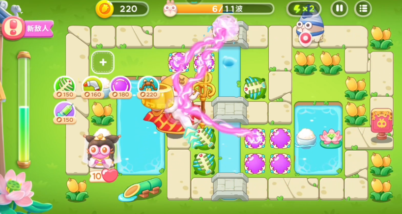 等怪物突破前方防线后,大家再一起攻击它们。到了第四波,会出现一个穿袈裟的老僧精英怪,它血量特别高,只要碰到萝卜就会直接失败,所以大家必须击败它。这里推荐用鱼骨攻击,因为鱼骨攻速很快,适合消耗它的血量。另外老僧有个机制:受到一定伤害后会在原地停留一会儿,这时候大家可以趁机在它周围多放些炮台。