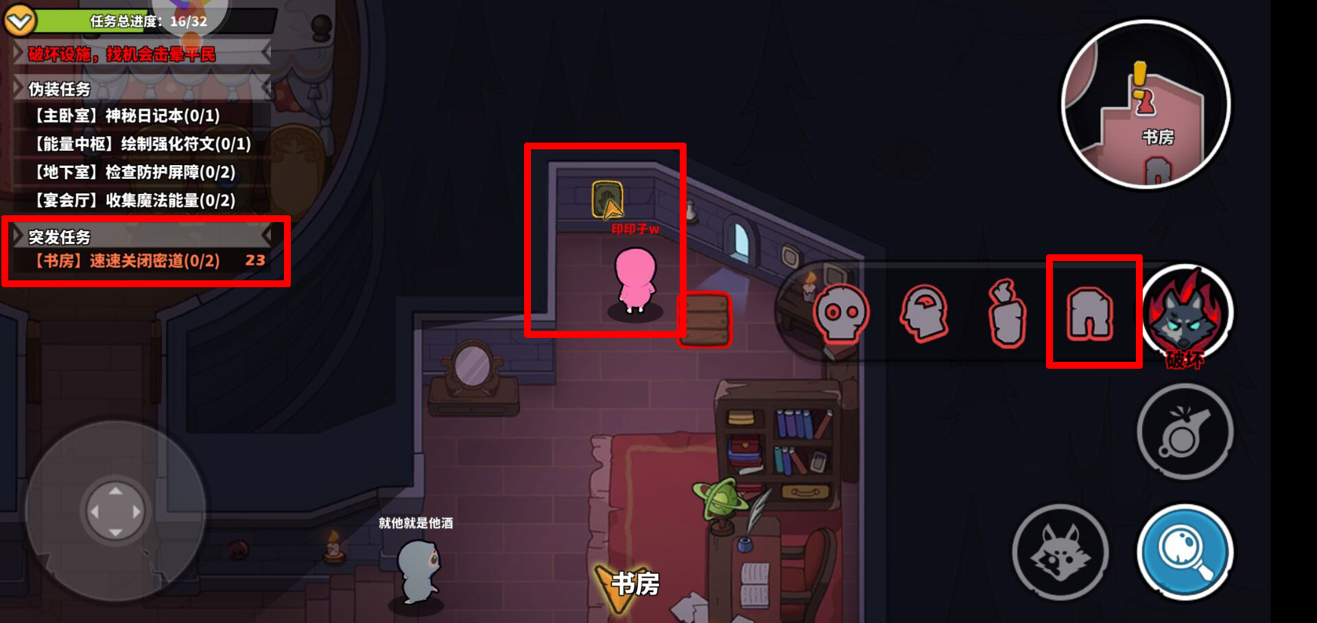 值得一提的是书房任务,它的名字叫“速速关闭通道”,作用相当关键。这个任务位于地图最右侧,离边缘很近,完成条件是要同时按住上下两个按钮——如图所示,上方有一个按钮,下方还有一个,这意味着得两个人配合才能完成。由于任务地点比较偏僻,很适合用来转移平民的注意力。比如,在左边击倒一个平民后,立刻发布书房任务,吸引所有人赶往地图右边,自己也快速往那边移动,远离事发地点,等其他人发现情况时,就能降低平民对自己的怀疑,所以这个任务的帮助很大。