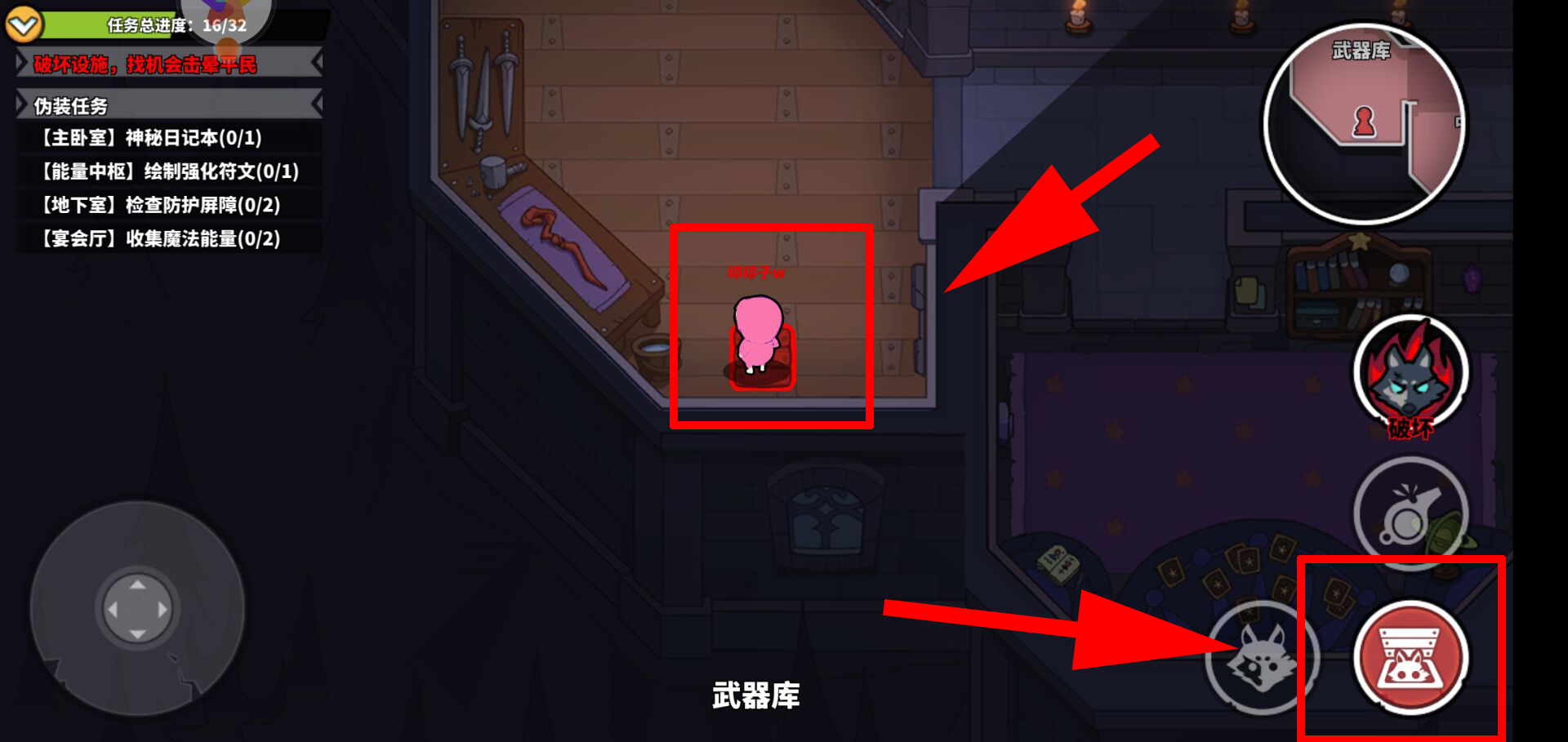 除了发布紧急任务外,狼人还拥有钻地道这一独特技能。作为狼人,在行进过程中看到的所有井盖都会呈现红色,这就表明自己能够钻入其中。钻地道的操作十分简便,只需走到地道上方,点击钻地道技能即可,具体可参考图示。此外,进入地道后还能在地道内移动,实现向地图各区域的瞬移,之后再从对应区域的井盖钻出,该技能通常用于作案后通过井盖逃离现场,以洗脱自身嫌疑。