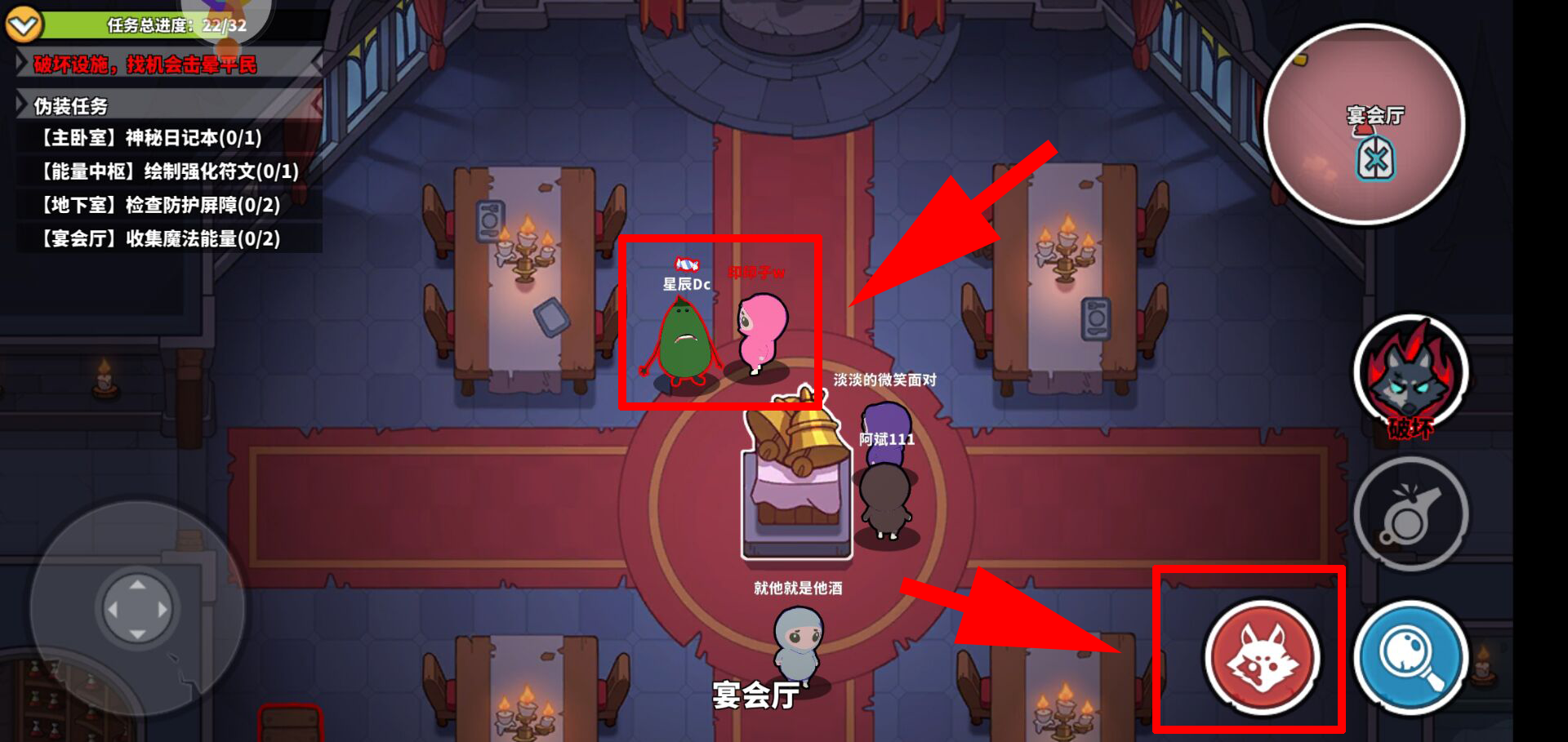 狼人的技能指的是他们的一些独特操作,毕竟作为反派阵营,人数上不占优势,狼人自然拥有多种手段。首先要介绍的是狼人的技能之一——破坏设施,这个技能共有四个按钮,能破坏不同的设施并触发紧急任务,要是平民没能完成这些任务,游戏就会直接结束!