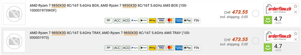 美国零售商SHI已上架锐龙7 9850X3D处理器,其标价为553.09美元,换算成人民币约为3895元;而瑞士的一家零售商此前则给出了473.55瑞郎的售价,约合人民币4192元。
