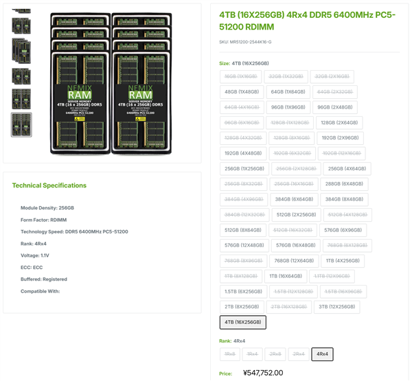 Nemix RAM是一家专注于各类内存销售的供应商,其当前在售的顶级内存产品为一套4TB DDR5大容量套装,该套装专门适配大型服务器使用。