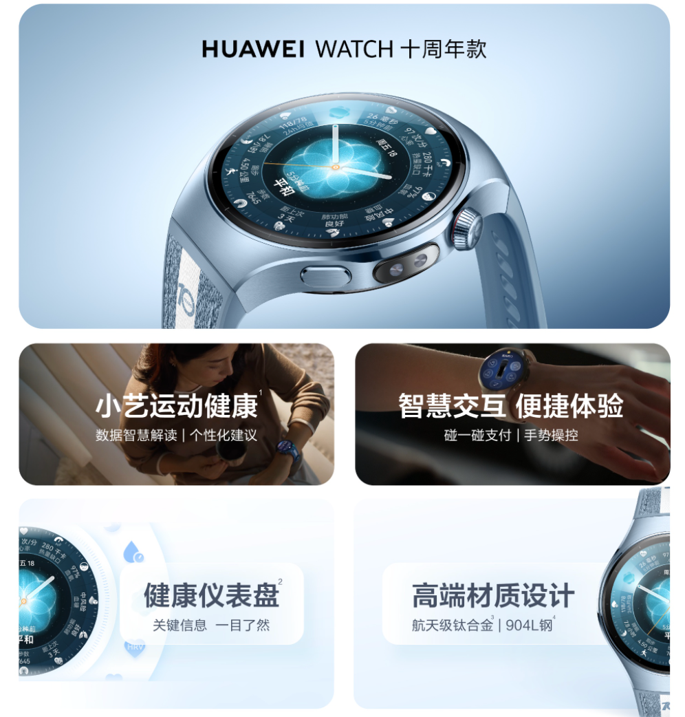 若说华为WATCH 5展现着当下最前沿的智慧体验,那么华为WATCH十周年款,更多承载的是时间与情感的象征意义。十年这一节点,本身就有着非凡的分量。穹宇蓝与极地白的配色,兼具科技感,又不失克制与优雅。表冠和表带内侧的“10 YEARS”标识,更添纪念价值。功能方面,华为WATCH十周年款与华为WATCH 5高度一致,而其全新的表盘设计,将十二大核心健康指标整合到同一视觉体系中,时间流转与身体状态变化得以同步呈现,用户只需一眼便能捕捉健康趋势。