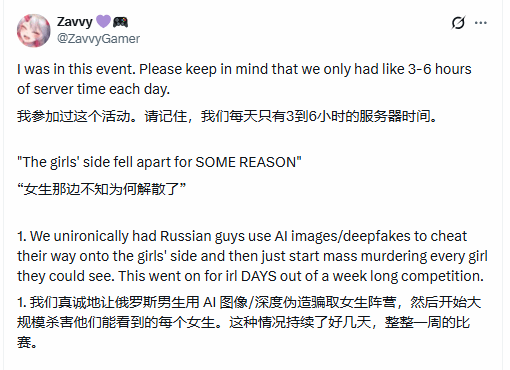 据VTuber Zavvy透露,部分男玩家通过AI生成女性照片蒙混过报名审核,悄悄混入女生阵营,随后对女玩家展开了持续数日的大规模“攻击”。除此之外,还有证据表明这些混入者在游戏里留下了侮辱性的话语。