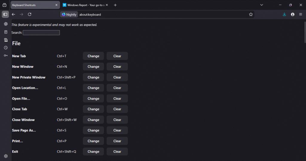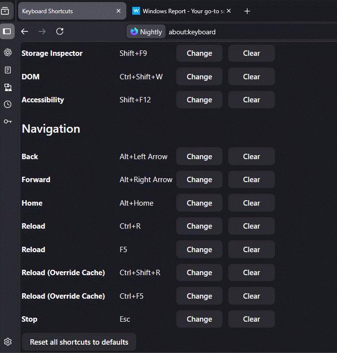 目前,Firefox Nightly(每夜版)已新增自定义快捷键的功能,用户只需在浏览器地址栏输入 about:keyboard 即可进入自定义页面。这个页面会完整呈现所有快捷键列表及其对应的按键,每个条目旁都设有更改和清除按钮,和 about:config、about:cache 等页面的设计风格保持一致,整体界面简洁清晰、易于查看。
