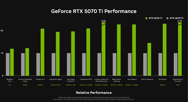 英伟达表示,RTX 5070 Ti 配备了支持多帧生成技术的 DLSS 4,在 2560×1440 分辨率下,开启最高画质与全景光线追踪运行《心灵杀手2》《黑神话:悟空》及《赛博朋克2077》时,帧率最高能达到191 FPS;而在4K分辨率下,帧率则可达到149 FPS。