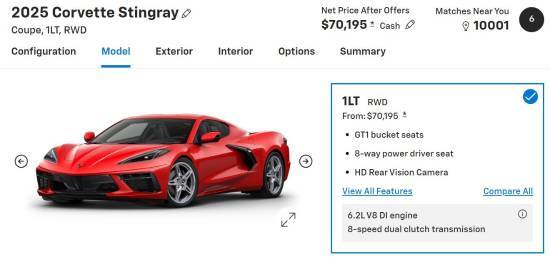 这是什么概念呢?2025款雪佛兰克尔维特Corvette Stingray 1LT跑车,价格也才七万多美元而已。