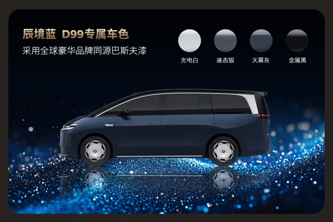 在色彩打造上,零跑D99秉持“自然共生”的设计理念,精心打磨出五款意蕴悠长的豪华外观配色,为车辆注入独特的视觉灵魂。其中,“辰境蓝”是零跑D99的专属配色,静止时尽显沉稳内敛的绅士风范,行驶在阳光下则会激活细腻的珠光效果,散发出年轻灵动的气息。为了呈现这种高级质感,零跑采用了与顶级豪华品牌同款的巴斯夫车漆,使颜色更具通透感、层次更显丰富,且光泽能够持久保持不易褪色。除此之外,光电白的纯粹冷峻、液态银的温暖优雅、天幕灰的深邃神秘以及金属黑的低调出众,这五款源于自然灵感的配色分别契合不同的审美偏好,让每一辆零跑D99都能成为用户个性与气质的延展。