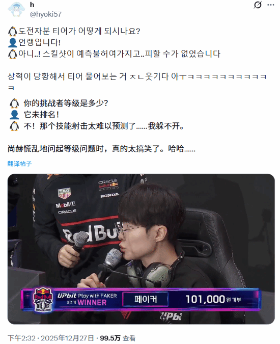 近日,《英雄联盟》T1战队的传奇中单选手Faker出席了“2025 Red Bull PC Bang Takeover”线下活动。令人意外的是,在和一位女粉丝进行的蒙多solo赛中,他一度陷入险境,险些被单杀,最终是以残血状态惊险获胜。
