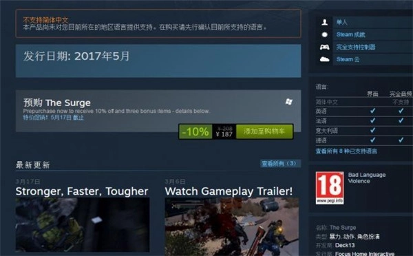 《迸发》在Steam国区的定价为208元,当前正进行九折优惠活动,折后售价187元,该游戏暂不支持中文。