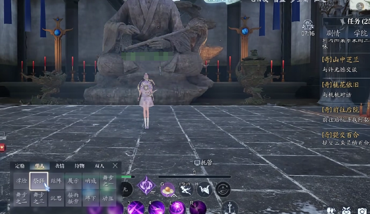 此刻,玩家把时间调至夜间,接着前往桃林的中心位置,在那里会发现一尊大佛。此位置能触发奇遇夜光杯任务,当月亮树下方的佛像闪烁光芒时,玩家开启表情功能,借助祭拜功能,触发奇遇的前置条件。触发成功后,玩家进一步进行祭拜,便能加快任务进度。
