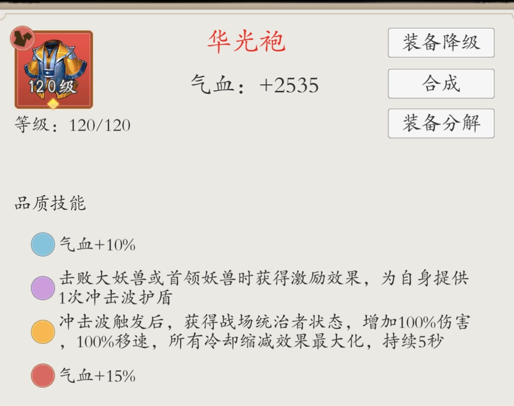 华光袍具备以下特性:能带来100%的伤害加成、100%的移动速度提升,技能冷却时间为0,这些效果持续5秒。在游戏前期,这件装备实用性很强;到了后期,对于一些特殊的玩法而言,它也有着独特的作用。