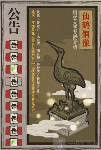 2、仙鹤铜像的设定与严大人所给物品大致相同,其加成无法与其他建筑的buff叠加使用。