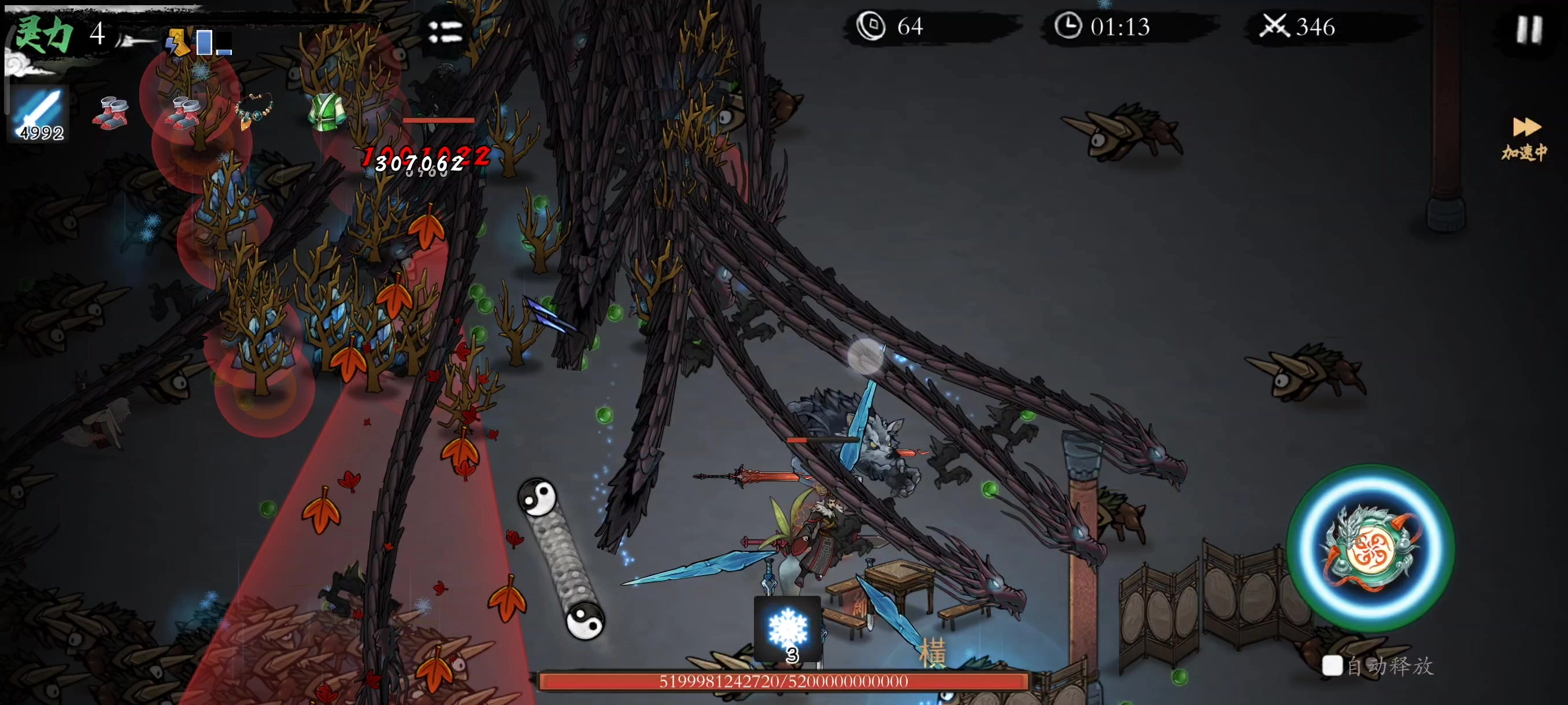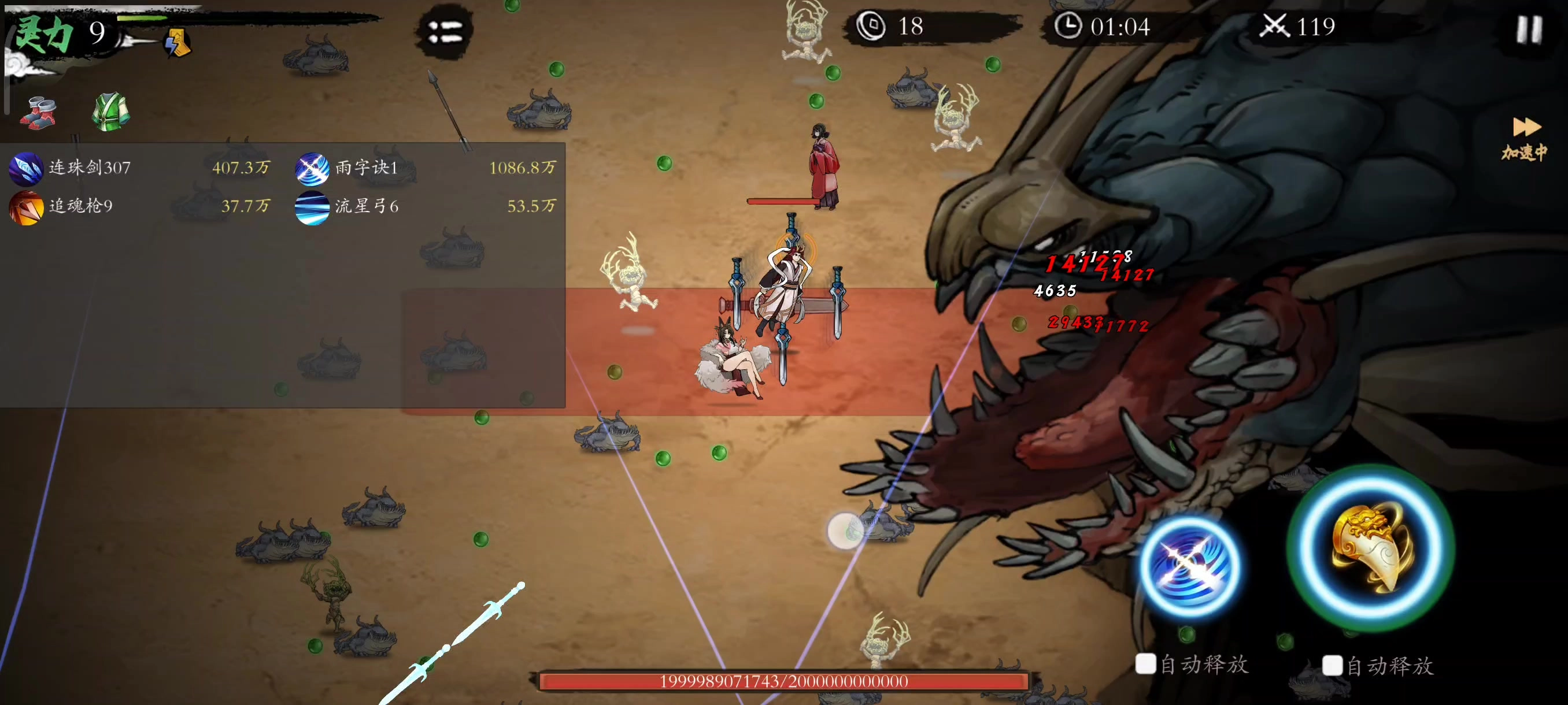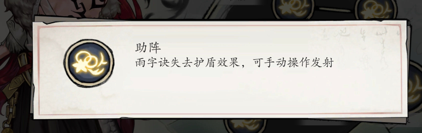 雨字诀:每一把飞剑都能让角色抵挡一次攻击(获得一次无敌效果)。只有集齐4把飞剑,才会主动发射。发射波次会依据弹道数增加,每次发射24支剑。要是这些剑全部命中同一个敌人,伤害相当可观。(雨字诀发射的瞬间锁定面板数值)
