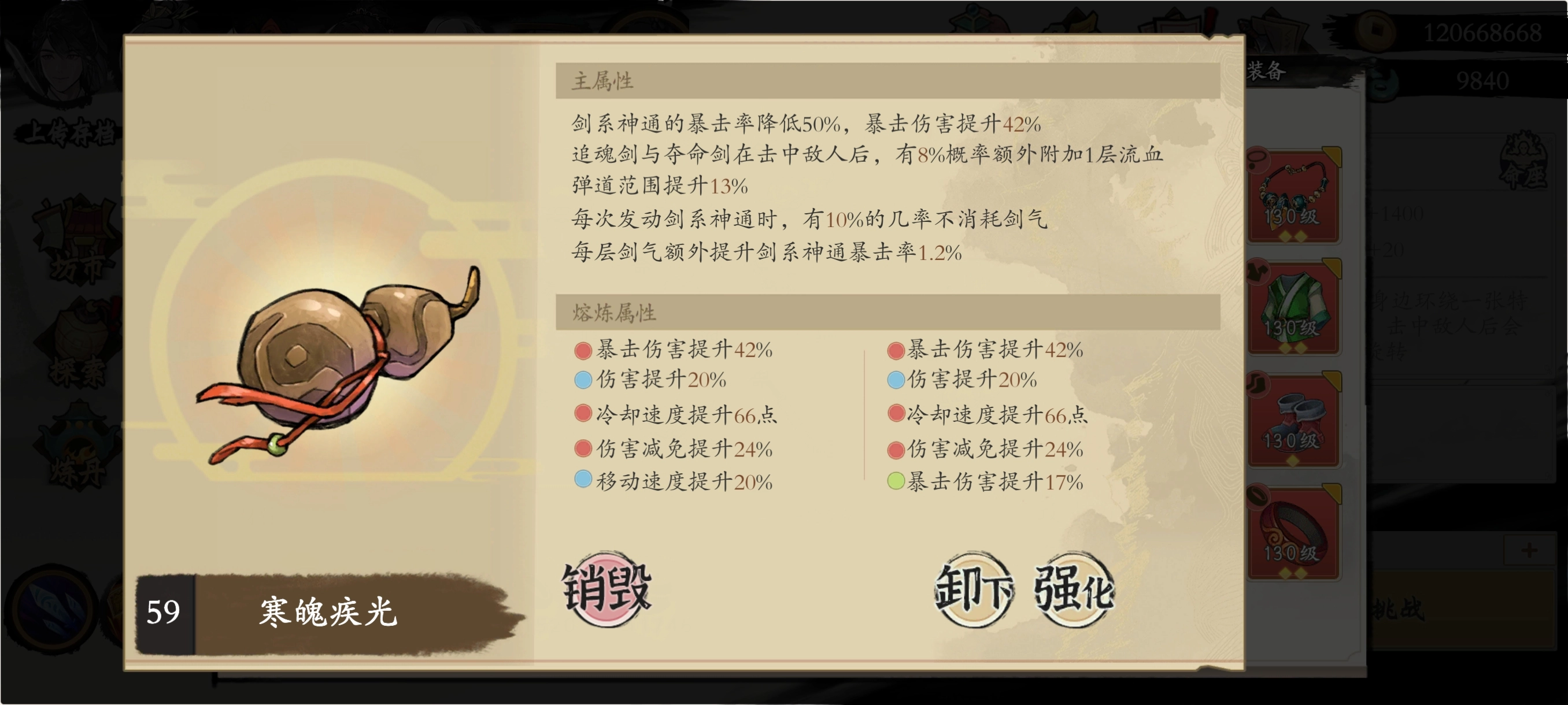 本命如下,舍弃了沉心和绯云门,换了遁龙门:满级12%几率不消耗剑气。开局拿到雨字诀就输出持平,赌到遁龙门原地起飞。
