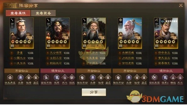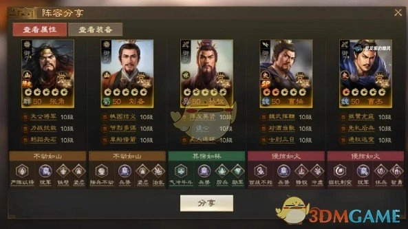 队伍中的主要输出角色为SP曹操,与此同时,SP张角与曹丕也具备一定的输出能力。刘备能够强力保护SP曹操,孙权携带谈心技能,给三位队友增加属性,如此一来,便不会出现主C阵亡后辅助失去作用的状况。