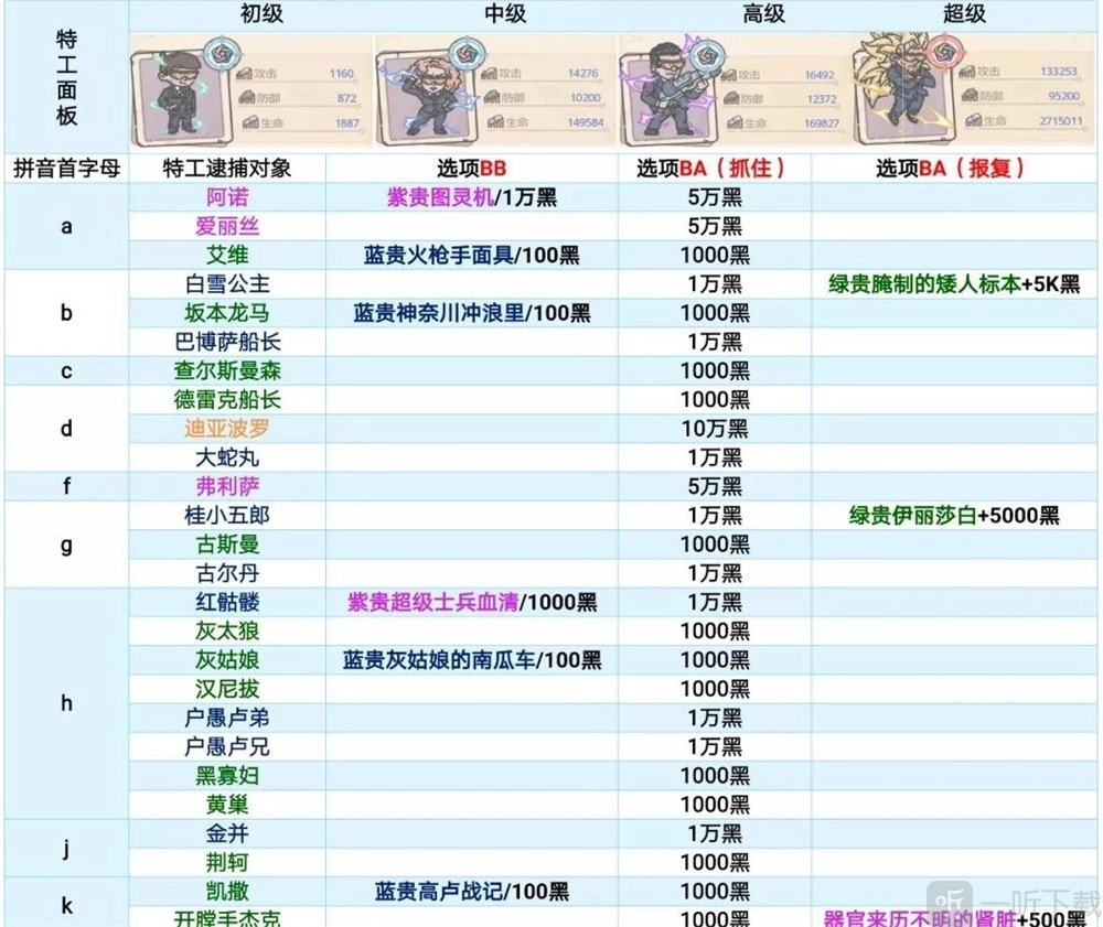 1、在AA选项中执行打特工任务,每种不同形象的特工都对应有绿色贵重物品。对于已经获取了相应绿贵的情况,后续会给予白蝌蚪以及灵魂。特工等级划分为:超级(以赛亚人为代表)、高级(非赛亚人男性A)、中级(女性B)、低级(柯南C )