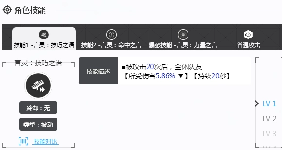 言灵:技巧之语这就属于一个核心被动技能,一旦在被攻击次数达到20次之后。那么全体队友的伤害都会降低,并且还会持续20秒的时间。随着技能逐渐的提升,等级减伤效果还会比较强烈,在团队战斗的过程中就会拥有重要的作用。