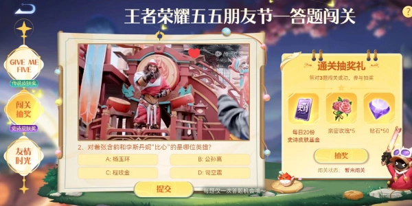 王者荣耀的五五开黑节活动已正式上线啦!各位玩家们,在活动期间都上了几颗星呀?今天可是这个活动的最后一天咯。官方特意推出了五五开黑节答题闯关活动,带大家一起回顾活动中的精彩瞬间。只要完成答题活动,就能免费获得丰厚奖励哦!下面就给大家汇总王者荣耀五五开黑节答题闯关的答案,快来瞧瞧吧。