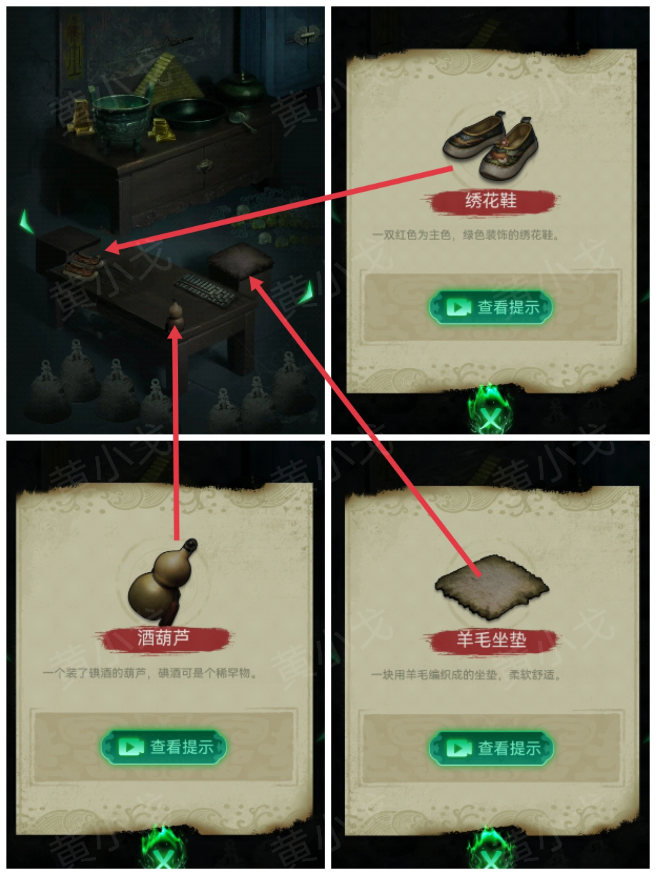 3.拿起桌子上的【酒葫芦】与【绣花鞋】;还有凳子上的【羊毛坐垫】