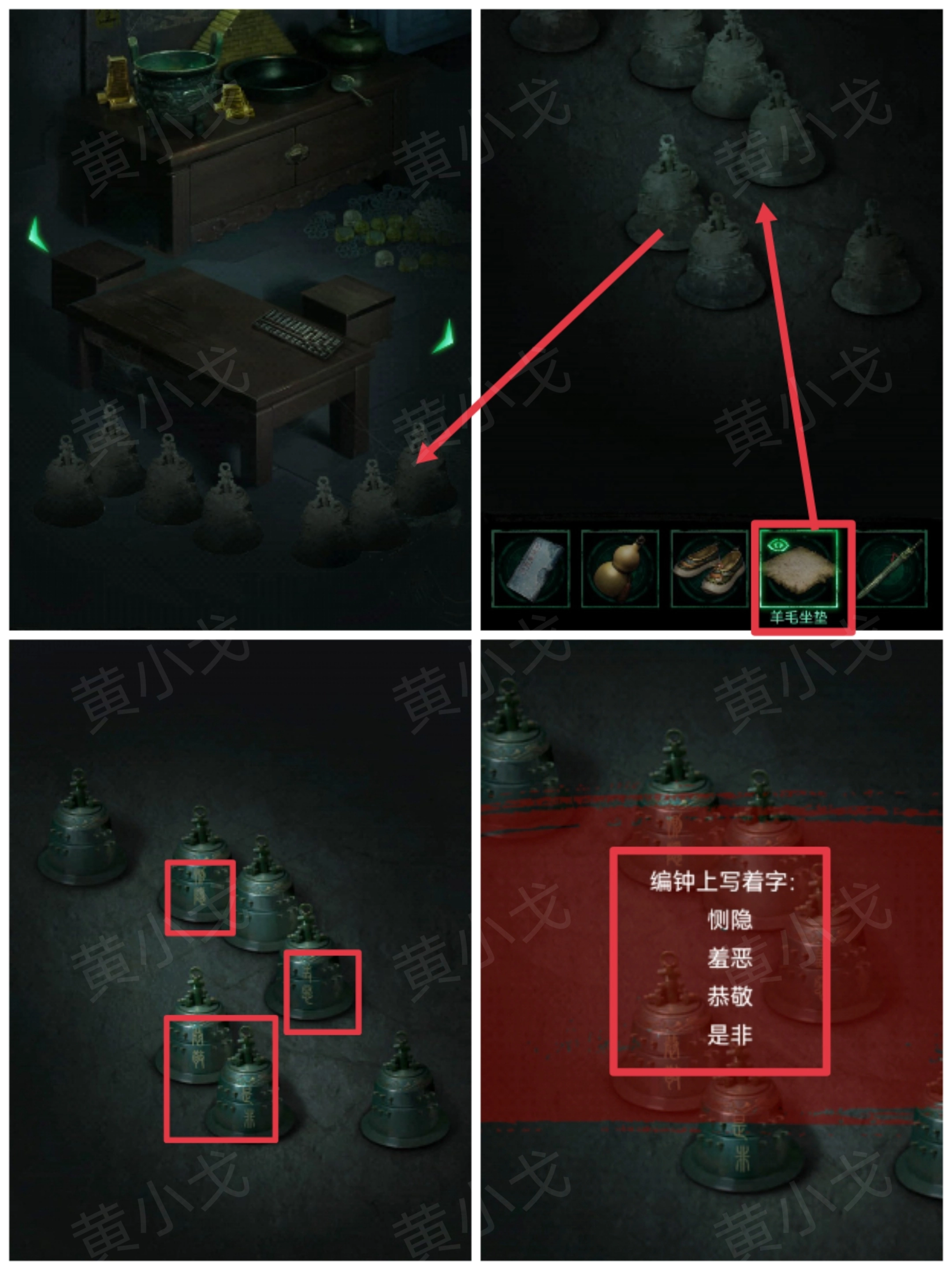 6. 轻点地上的编钟,接着使用【羊毛坐垫】,从而获取线索。