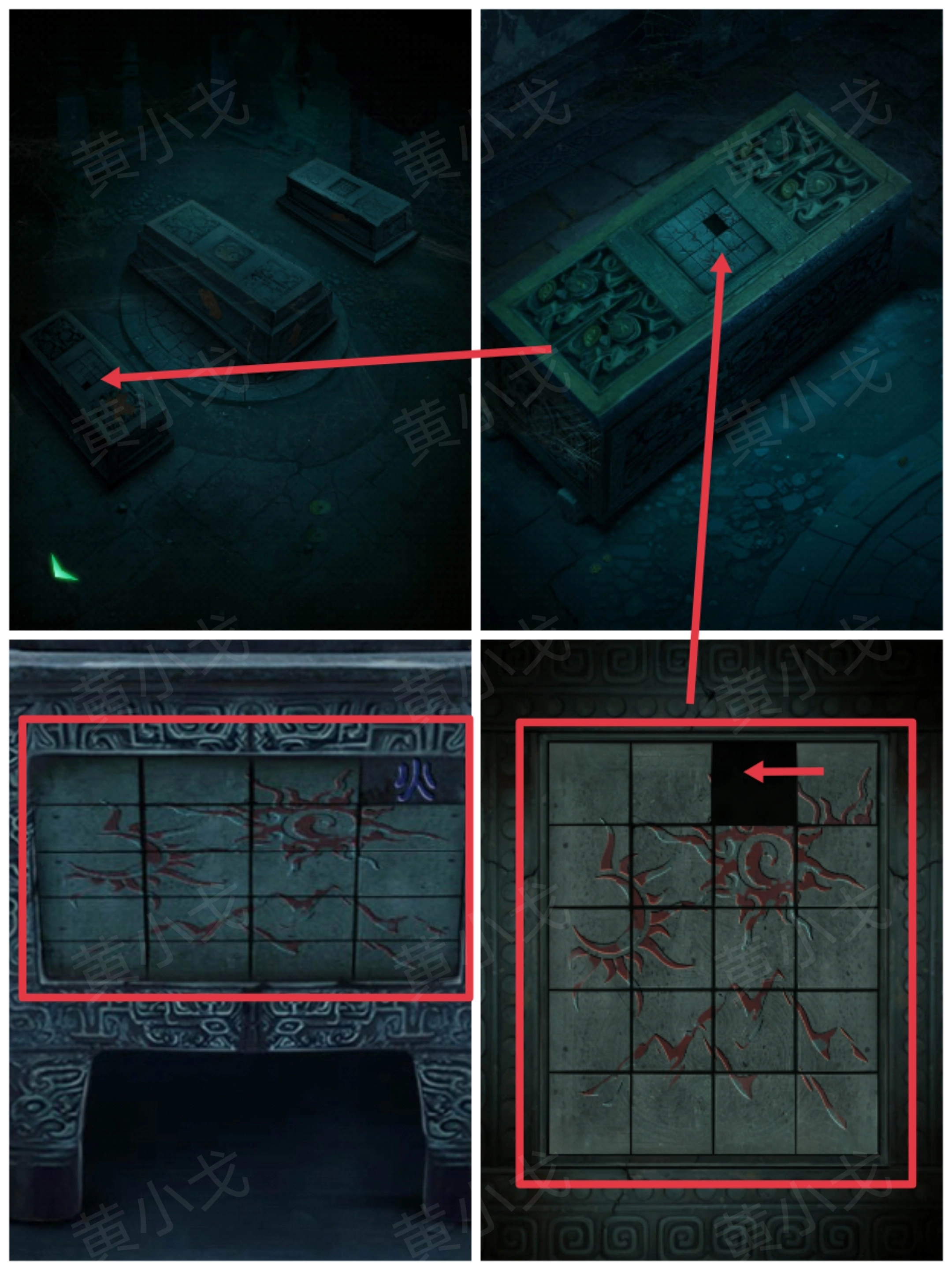 14. 轻点左侧棺材上的机关,依据青铜鼎上的图案来完成华容道小游戏。