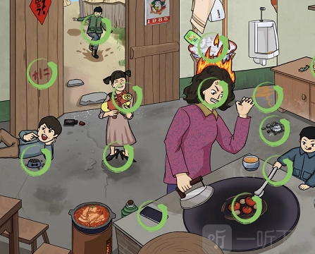 2、点击灶台上的【手机】可以发现少玩手机,长按小女孩手里的【水枪】找到妈妈降火,门上有【口红涂鸦】,小女孩穿着【高跟鞋】,小男孩在【炒菜】,左边的小男孩在吃【狗粮】,后面的脸盆是【洗发水洗脸】,妈妈成了【落汤鸡】,外面是【踏浪男孩】。