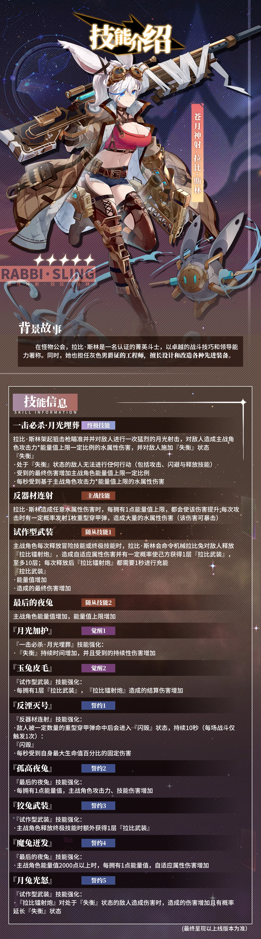 拉比·斯林迅速架起狙击枪,精准瞄准敌人后,发动了一次威力强劲的月光射击。此次射击会依据主角角色攻击力与能量值上限的一定比例,对敌人造成属性伤害,同时还会给敌人施加“失衡”状态。