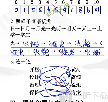 3、第三题的答案如下:①10987654321;②火烧、烧炭、炭烤、烤串、串门、门庭;③开垦荒地、设计方案、治理黄河、保护资源。