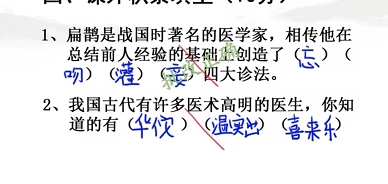 4、第四题的答案为:①望闻问切 ②华佗、扁鹊、李时珍。