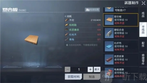 塑合板与硬铝合金这两种材料,可用松树脂和杜松木制作。这两种半成品能用于打造50级装备。在科勒矿山66号旅馆附近以及赛内加火车站附近,生长着大量树木,若想获取松树脂与杜松木,去这两个地方采集速度会比较快。
