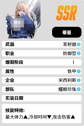 蒂亚是游戏里的防御型角色,拥有含金量颇高的SSR品阶。她手持发射器,隶属于米西利斯企业旗下部队。技能方面,普通攻击是充能模式,需蓄力1秒,蓄力完成后,能对目标造成相当于攻击力61.3%的伤害。若达到全蓄力的理想情况,伤害十分可观,可达250%,其中核心伤害为200%。此外,她的最大装弹数为6发,换弹时间仅2秒。