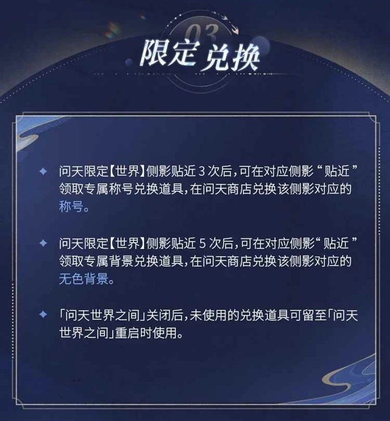 4、问天限定【世界】侧影贴近3次后,可在对应侧影“贴近”领取专属称号兑换道具,在商店兑换该侧影对应的称号。