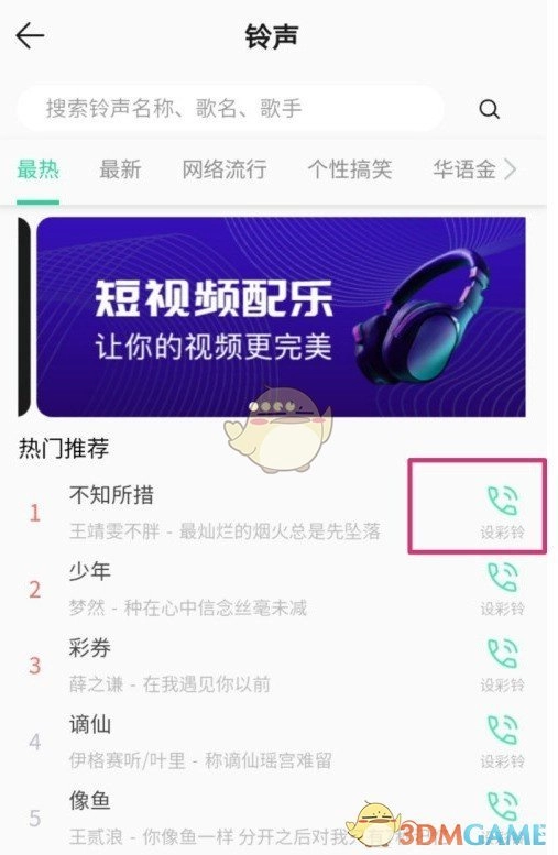 4、接下来,大家能够依据搜索或者在专区查找,找到自己心仪的彩铃,点击右侧即可进入。