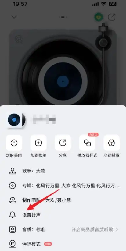 1. 打开QQ音乐,进入歌曲播放界面,点击界面上的两点图标,接着点击“设置铃声”,就能完成操作。