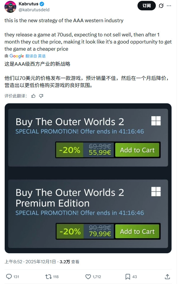 此次促销活动属于Xbox第一方工作室的黑五特别优惠,除了《天外世界2》之外,《忍龙4》《战争机器:重装上阵》《宣誓》《午夜之南》《极限竞速:地平线5》等作品也都在进行不同力度的折扣促销。