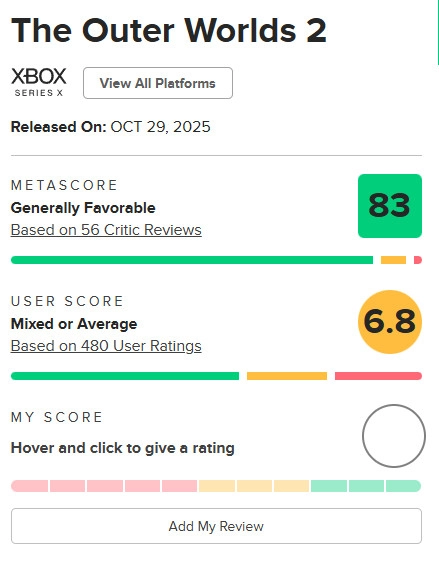 《天外世界2》于今年10月30日正式发售,其简体中文版本的用户评价呈现褒贬不一的态势。在已有的597篇评价里,仅有63%的用户给出了好评。而在Metacritic平台上,这款游戏的用户评分也大致相当,为6.8分。