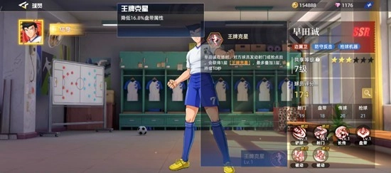 利刃气旋是被动增益效果,当早田诚射门造成对方门将脱手时,能让禁区内的我方队友获得3.7%的争顶属性加成,效果持续10秒,可有效填补自身争顶能力的不足。王牌克星则属于全队范围的反制技能,每当对手进行射门或抢点操作,早田诚就会获得1层状态,最多可叠加至3层,每层能使对方盘带属性降低16.8%,持续时间为10秒。这套技能组合让他在应对对方进攻核心球员时拥有非常强的限制作用。