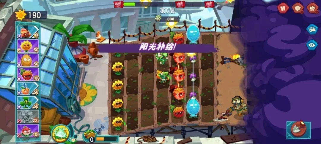来到第6关,布局和上图一样,收集阳光后种满“榭寄生投手+岩浆玉露”的组合,再合理搭配玉米卷和闪电技能,就能顺利通关了。