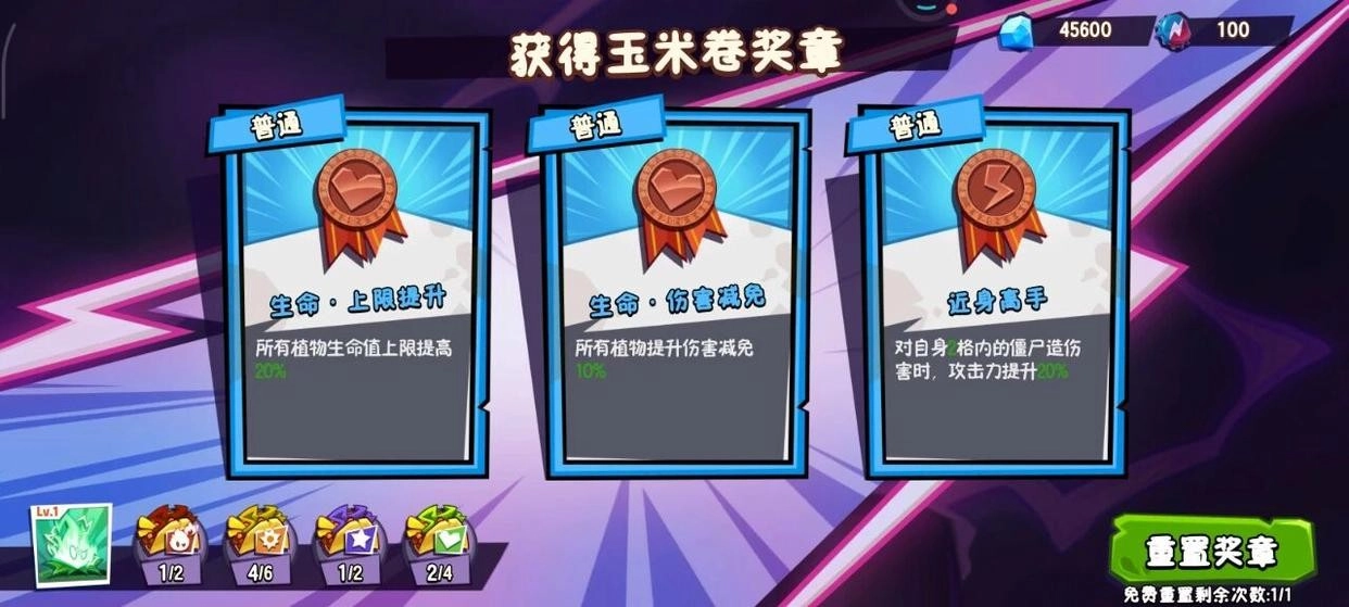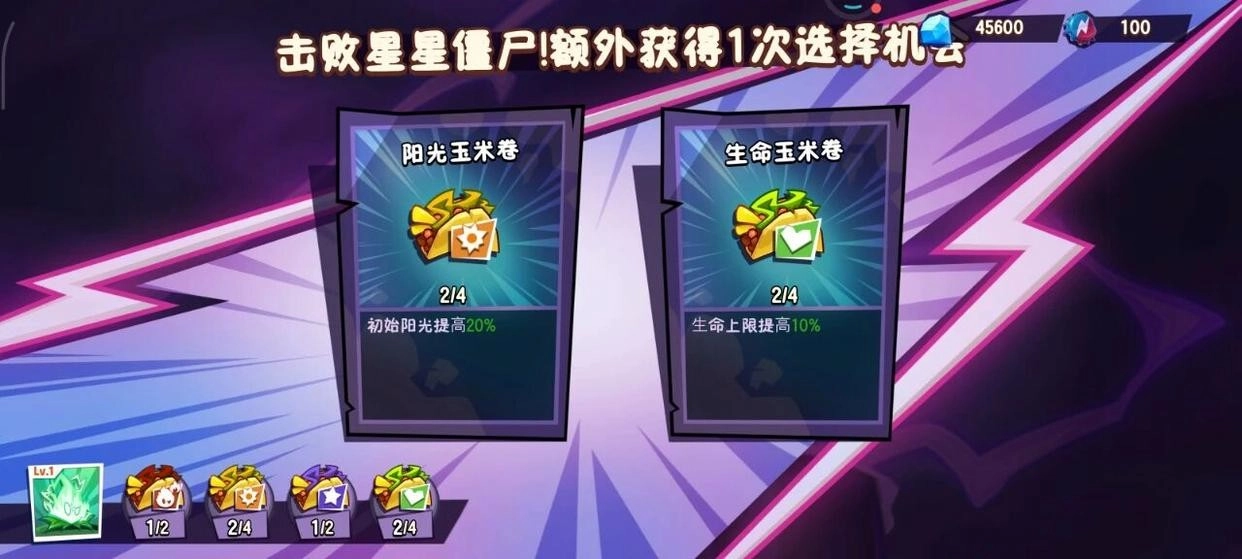 ps:当我们在关卡中击败星星僵尸后,会出现玉米卷和玉米卷奖章的加成选项供选择。建议优先挑选能增加阳光的加成,接着选择可以提升攻击力的,最后再考虑伤害减免类的加成。