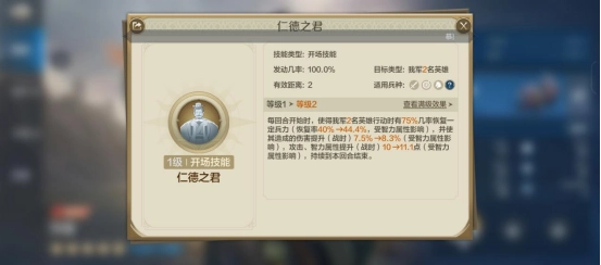 在每回合开启之际,我军会有2名英雄在行动时,有75%的概率回复一定数量的兵力(回复率为40%【升至满级可达80%】,该回复率受智力属性影响)。同时,这2名英雄造成的(战时)伤害会提升7.5%【满级能提升至15%】(伤害提升幅度受智力属性影响),并且其攻击、智力属性(战时)会提升10点(满级可提升至20点,属性提升量受智力属性影响),以上效果一直持续到本回合结束。