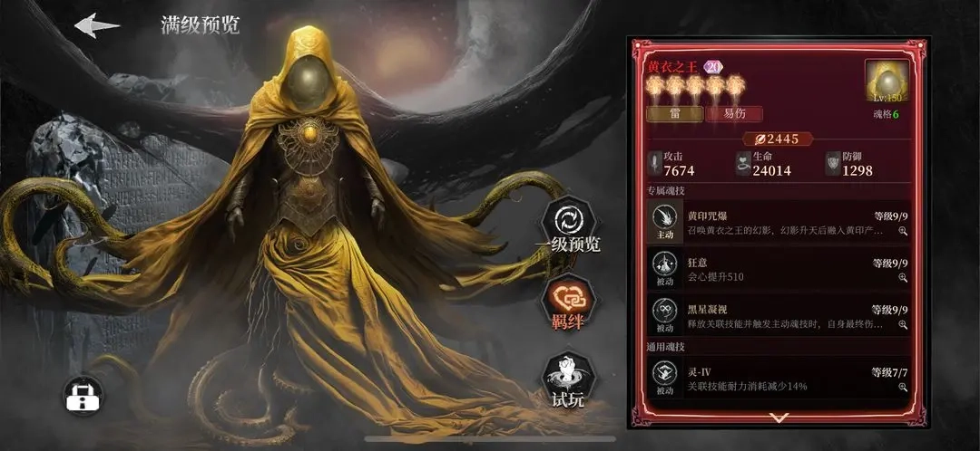 黄衣之王的一技能黄印咒爆为敌方附加的易伤效果是独立计算的,能与多数伤害增益形成乘区互补。该魂核的二技能狂意可提供常驻会心属性,和奥丁的暴伤加成体系高度契合。它的羁绊黄印之凝视在常规配队时能带来超50%的攻击力提升,至臻等级还能增加80%全元素伤害,综合价值在当前版本处于前列位置。