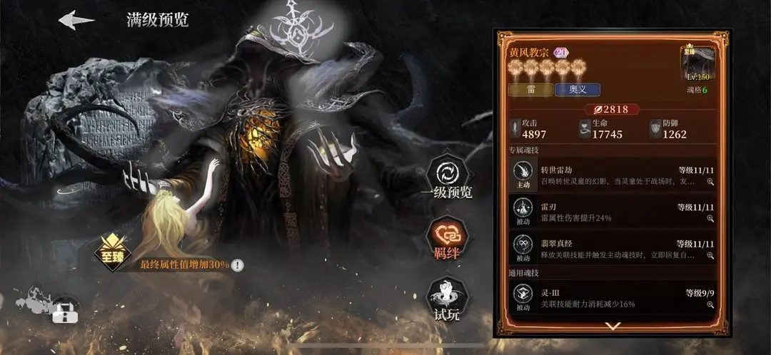 黄衣教宗的一技能“转世雷劫”融合了增伤祝福、雷云追击与灵童自爆三重机制,技能复杂度远高于普通原初魂核。尽管三技能的奥义回复在当前以魂技为核心的输出环境里效果有限,但它与黄衣之王形成的强力羁绊让其始终具备战略价值,可依据实际战况选择本体上阵或替身搭配。