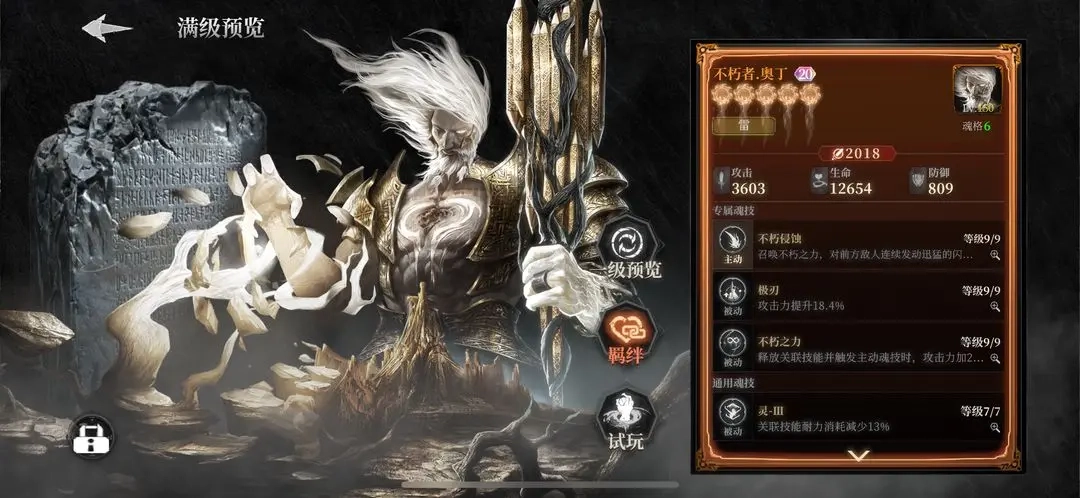 作为雷系的绝对核心,奥丁的三技能“天罚”在战斗时能提供独立乘区的暴击伤害加成,实战表现十分突出。它的魂技“禁魂雷殛”可以创造出持续存在的雷枪领域,搭配雷魂带来的属性加成,能够构建起稳定的输出环境。虽然阿萨荣光羁绊的被动数值因为是非战斗触发而有稀释的情况,但奥丁自身的技能强度已经足够支撑它处于顶级的位置。