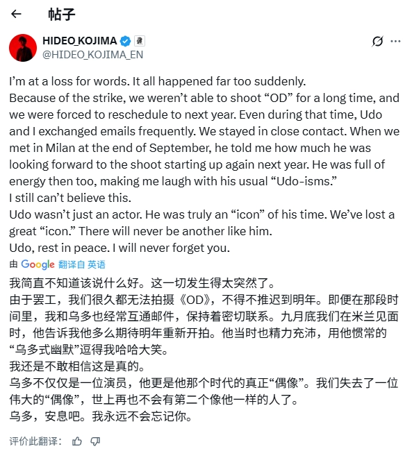 小岛秀夫称:“我实在找不到合适的话语来形容此刻的心情,事情发生得太猝不及防。因为演员工会(SAG-AFTRA)发起罢工,《OD》的拍摄工作不得不暂停,并且延期到明年。但即便如此,这段日子里我和乌多始终通过邮件保持着联系,我们的沟通十分频繁。9月底在米兰碰面的时候,他还告诉我自己特别期待明年能重新启动拍摄。那时的他依旧活力满满,用他独有的‘乌多式幽默’逗得我笑个不停。直到现在,我还是没办法接受眼前的这一切。”