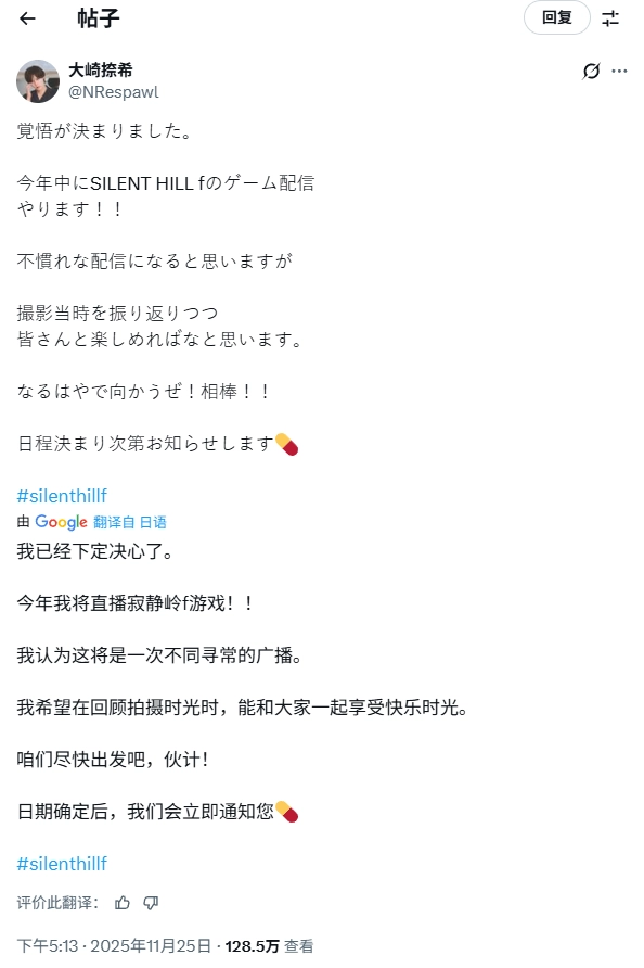 大崎捺希在社交平台X上透露,今年内他计划开展《寂静岭f》的游戏直播。尽管在直播操作上可能还不够熟练,但他期待能在直播中一边回忆当初参与拍摄时的种种经历,一边和观众们共同体验游戏的乐趣。具体的直播日程一旦确定,他会及时向大家告知。