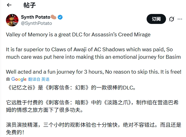 内容创作者Synth Potato在社交媒体上称,《刺客信条:幻景》的DLC“有着完整的过场动画,令人印象深刻”,但他认为这恰恰反映出系列叙事水准的下滑——因为如今“带有清晰导演意图的表演已不多见”。此外他还提到,《刺客信条:幻景》的剧情体验“要明显好于《刺客信条:影》的付费DLC《淡路之爪》”。