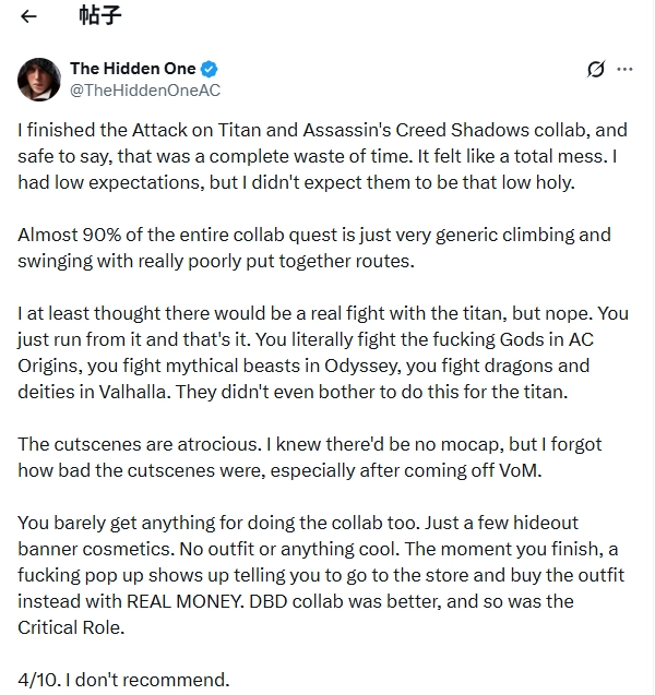 另一位玩家TheHiddenOneAC对《刺客信条:影》与《进击的巨人》的联动内容给出了负面评价,认为这是“一次彻头彻尾浪费时间的体验”。他提到,该联动中大约百分之九十的内容只是“常规的攀爬和摆荡路径”,并且设计显得较为粗糙。此外,他对于无法与巨人展开战斗感到失望,毕竟刺客信条系列此前已经有过与诸神、神话生物等对手交锋的经历,而这次联动却没能延续这样的设定。
